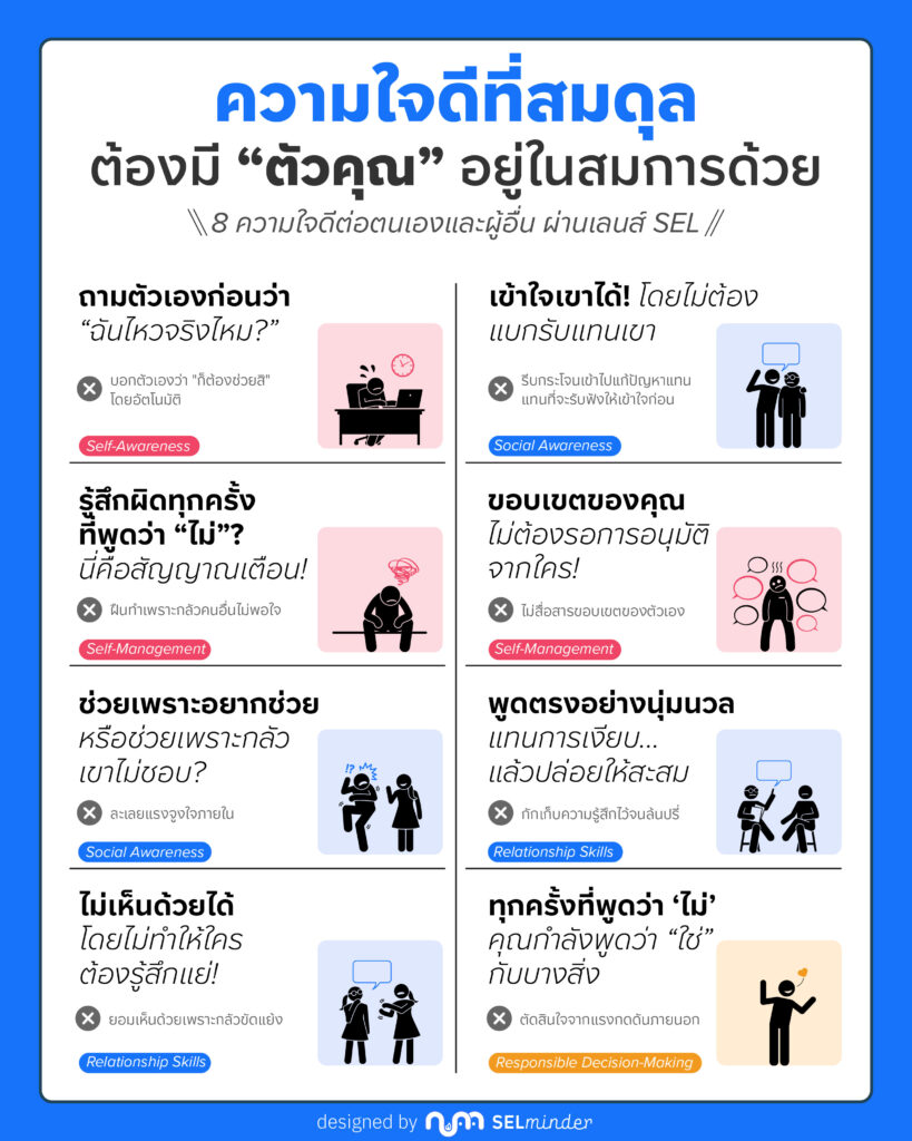 ข้อนี้เชื่อมกับ Self-Awareness ซึ่งเป็นรากฐานของ SEL ทั้งหมด เพราะถ้าคุณไม่รู้จักตัวเองก่อน คุณก็ไม่มีทางรู้ว่ากำลังช่วยจากความอยากช่วย หรือจากความกลัว